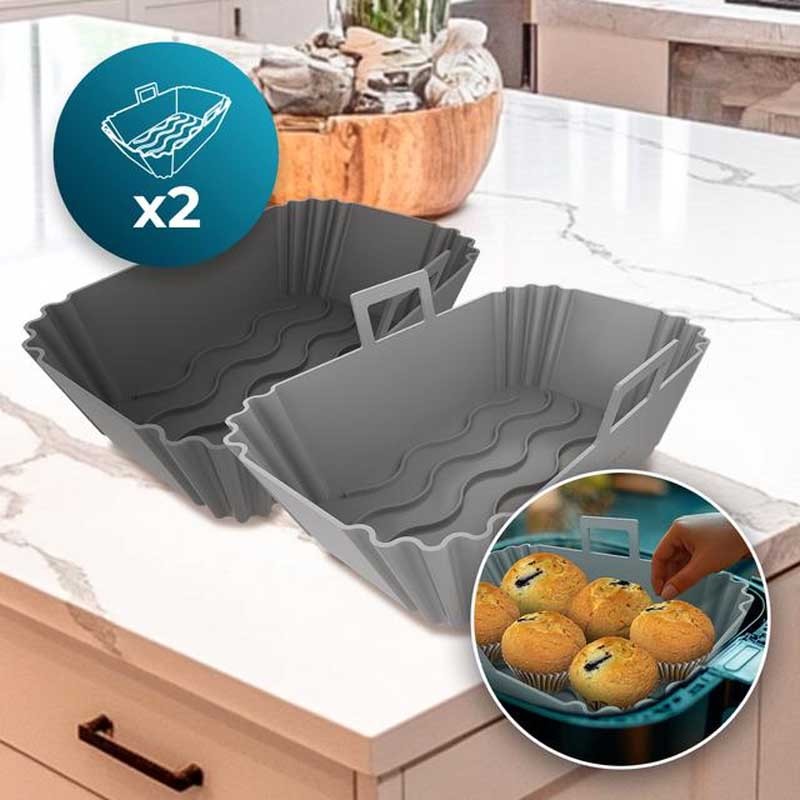 Pacote com 2 formas: Feitas de silicone, possuem formato retangular e são ideais para fritadeiras a ar, oferecendo opções versáteis de tamanho.