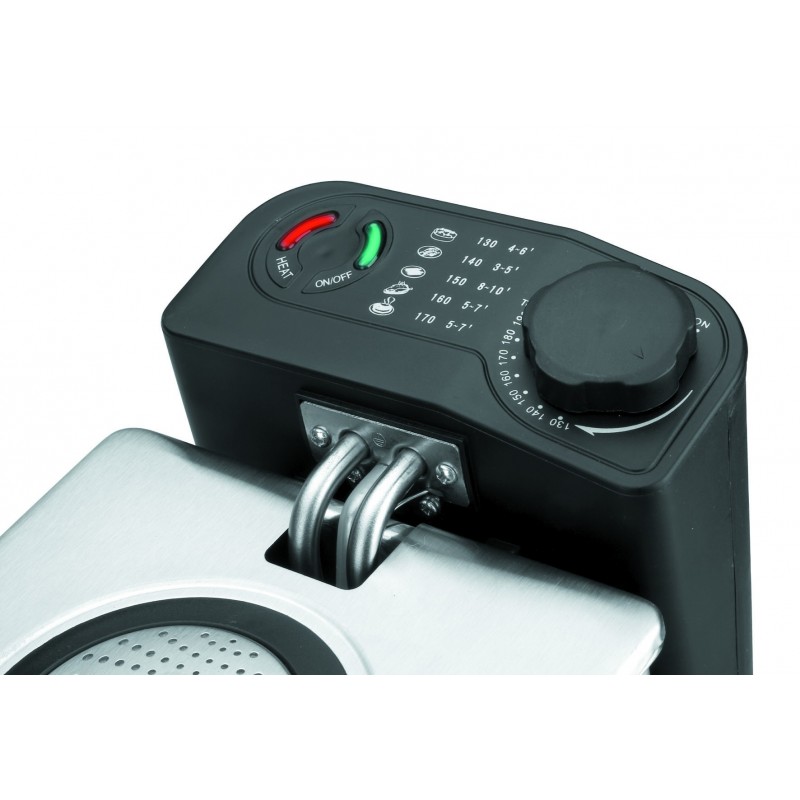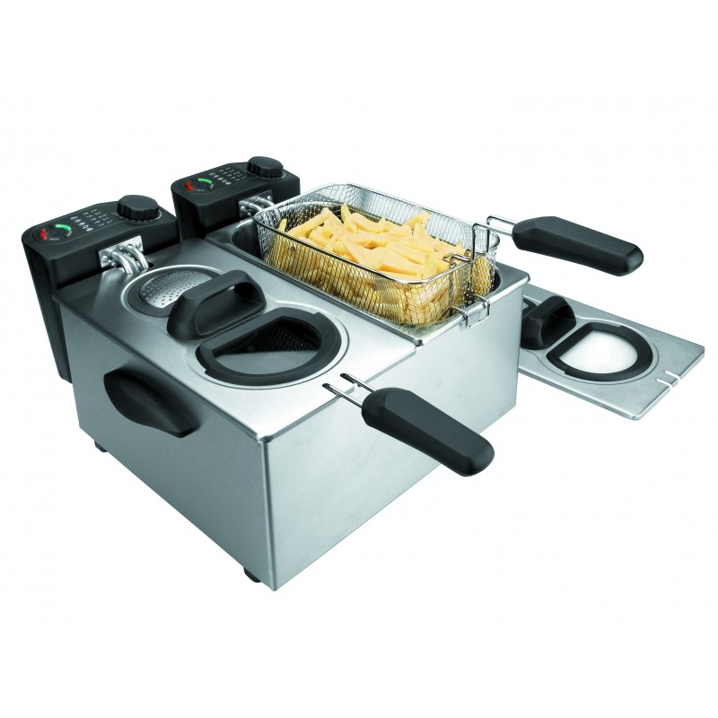Fritadeira elétrica de grande tamanho, fabricada em aço inoxidável, com duas cubas e cabeçotes de uso independente. Totalmente desmontável para uma limpeza fácil. Potência de 4000 W, capacidade de 3,5 litros por cuba, temperatura de 180ºC e dimensões de 36 x 41 x 17 cm.