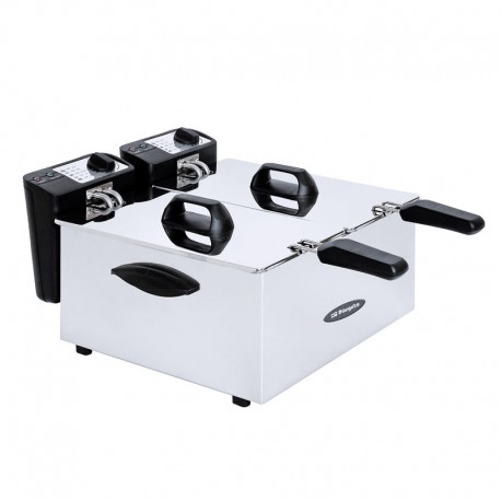 Fritadeira dupla em inox, com capacidade total de 7 litros (3,5 L cada balde), da marca Orbegozo.