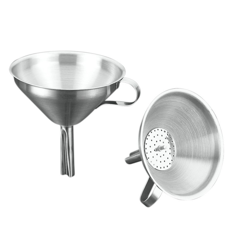 Funil com filtro fabricado em aço inoxidável, com um diâmetro de 13 centímetros.
