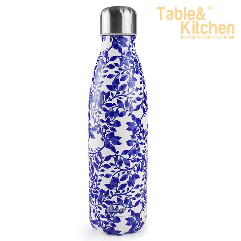 Esta é a Garrafa Termo Florence da Ibili, com uma capacidade de 500 ml. Trata-se de uma garrafa térmica metálica livre de BPA com um design original de flores azuis sobre fundo branco.
