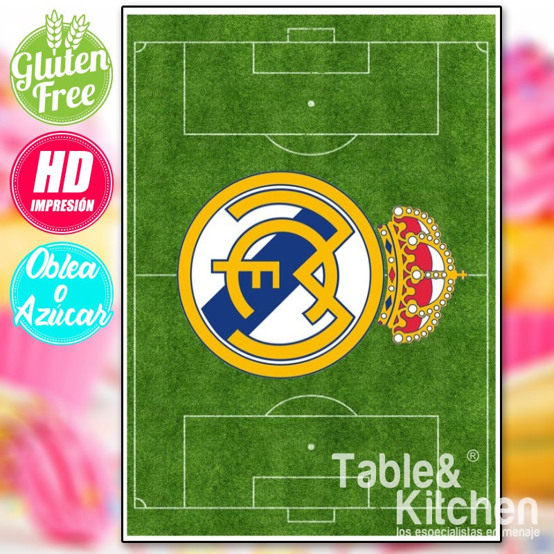 Impressão comestível para decoração de bolos com design do escudo do Real Madrid com campo de futebol. Desenhado por Table&Kitchen. O formato de impressão é um Din A4 (29 cm de altura x 21 cm de largura).
