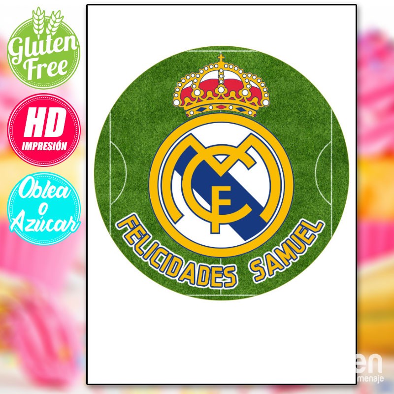 Impressão comestível para decorar bolos com o escudo do Real Madrid e o campo de futebol, modelo 002. Desenhado por Table & Kitchen.
