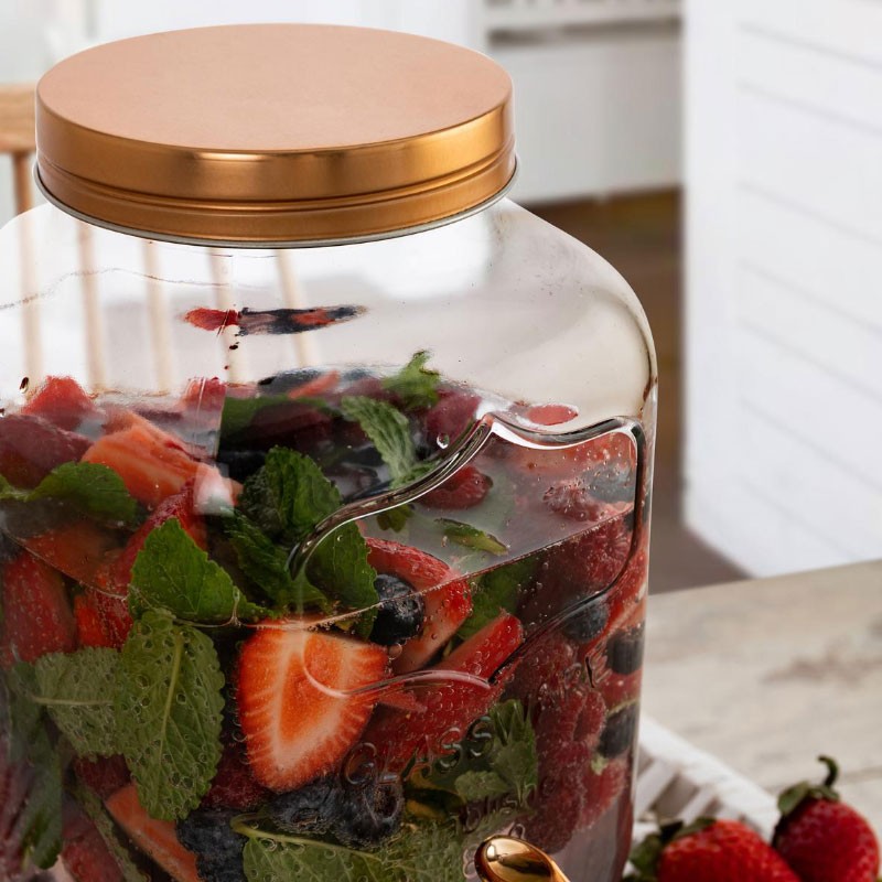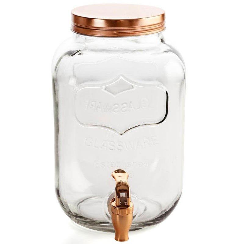 Fabricado em vidro com letras em relevo, tampa de metal e torneira de plástico.