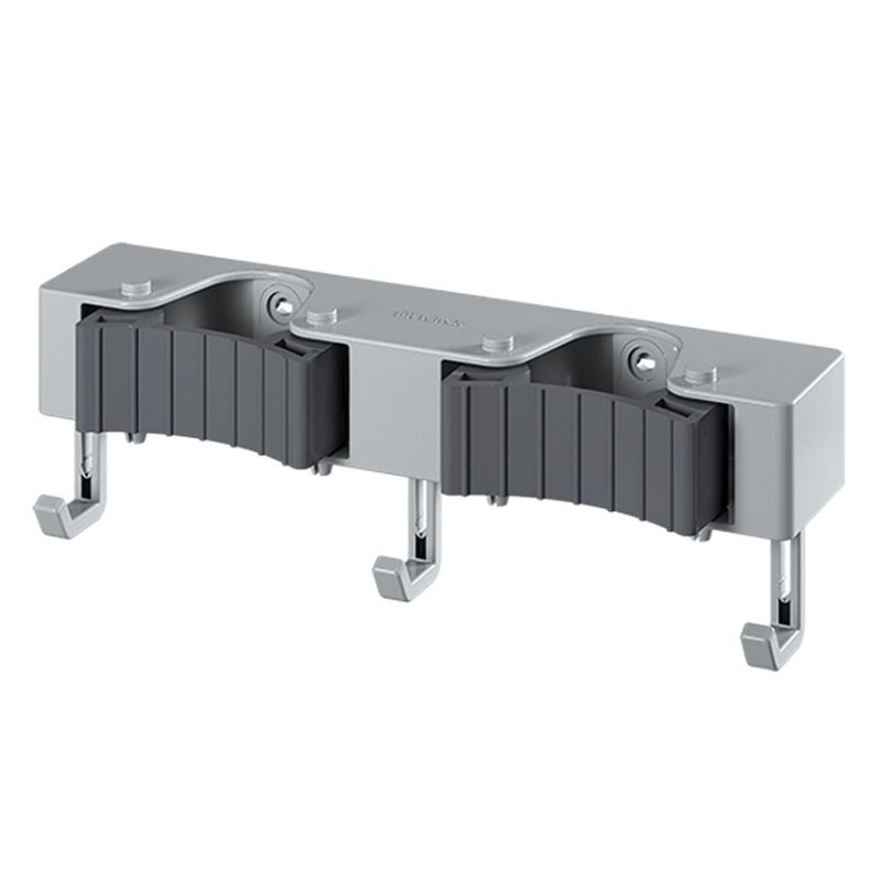 Suporte duplo de parede para pendurar utensílios de limpeza.