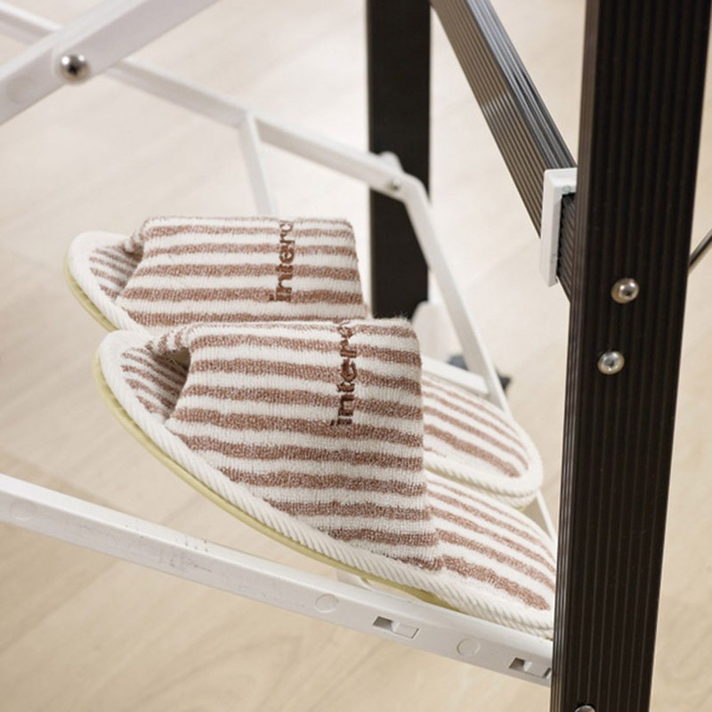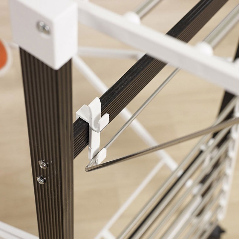 Varal dobrável HABITEX com varas de aço inoxidável e remates de ABS. Equipado com rodas de transporte que incluem freio para maior estabilidade. Seu design compacto permite um fácil armazenamento, ocupando pouco espaço quando está dobrado. Apresenta um estilo bicolor branco/preto e oferece uma capacidade de secagem de 23 metros.