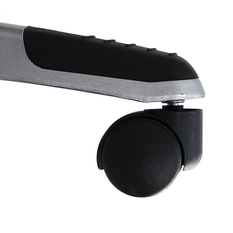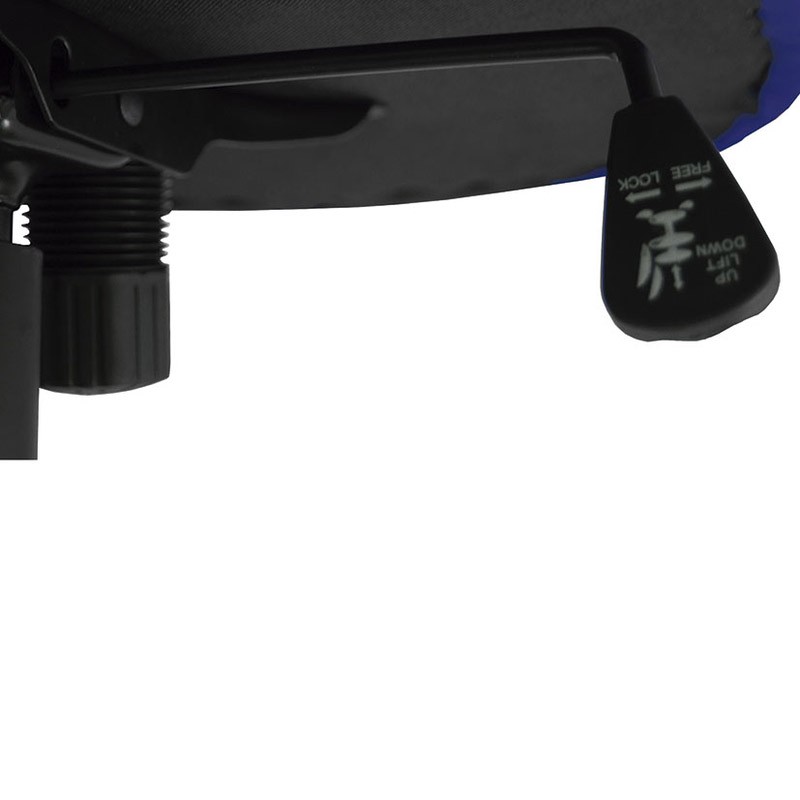 Cadeira de escritório modelo Victoria com apoios de braço dobráveis. O assento é feito de material sintético e a base é de nylon lacada em prata. Não é reclinável e é projetada na cor preta com detalhes em azul. Vem equipada com braços para maior conforto.