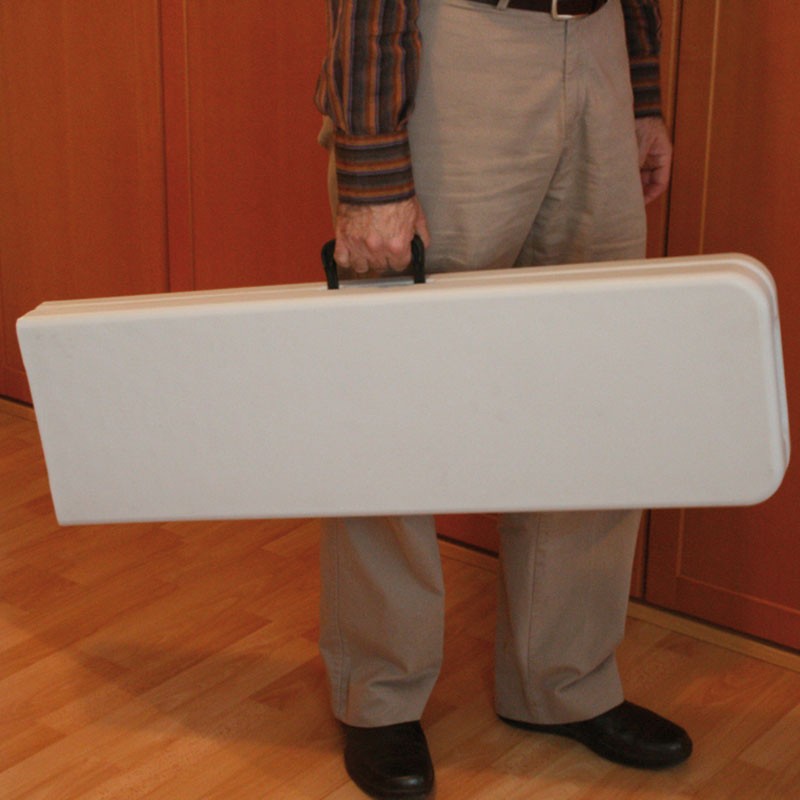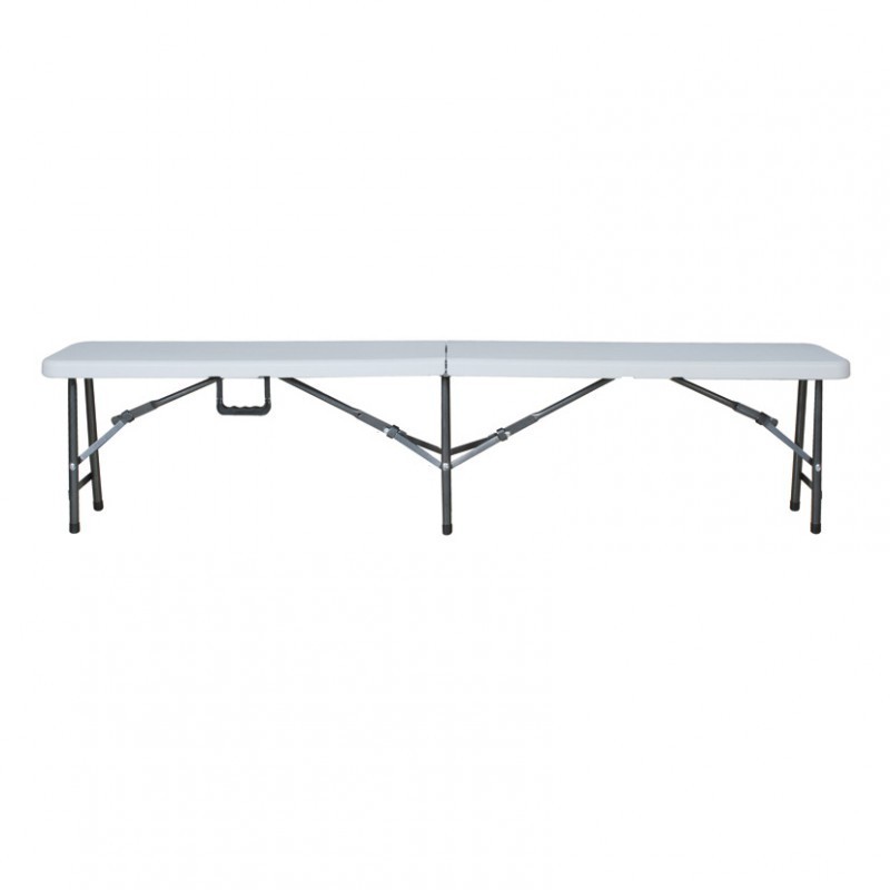 Mobiliário multiuso dobrável série branca. Banco com tampo de polietileno branco de alta densidade e estrutura em aço. Equipado com alça de transporte e sistema de dobra fácil.