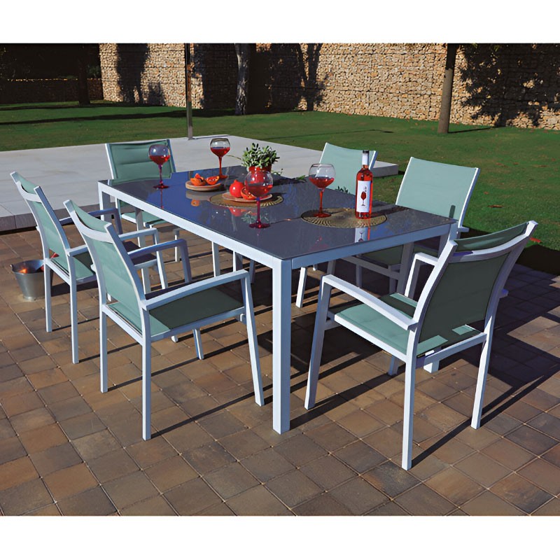 - Design sofisticado: Com uma estrutura de alumínio cinza claro e uma superfície de vidro, esta mesa combina elegância e resistência para criar um ambiente fresco e acolhedor em seu espaço exterior.