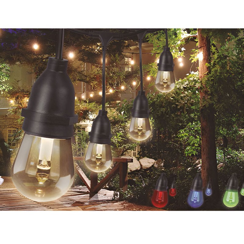 Fabricada com cabo de borracha preta de 14,6 metros, esta guirnalda inclui soquetes E27, controlador e controle remoto para alternar entre diferentes combinações de cores e criar a atmosfera perfeita. As lâmpadas de filamento LED de alta qualidade são resistentes a impactos e oferecem uma iluminação vibrante e duradoura. Ideal para iluminar exteriores, jardins ou terraços com cores sólidas ou para animar festas com alterações dinâmicas de cores. O design do cabo de borracha permite conectar até 3 conjuntos para cobrir áreas maiores. Além disso, possui classificação de impermeabilidade IP65 para maior tranquilidade em ambientes externos.