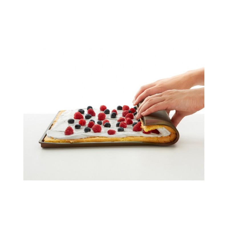 O roll cake é um tapete flexível e antiaderente com bordas antiderrame, ideal para despejar os ingredientes da receita e enrolá-los de forma compacta para que fique a forma do típico bolo (doce ou salgado) circular recheado. As bordas servem como base para assar receitas mais líquidas que não transbordem.