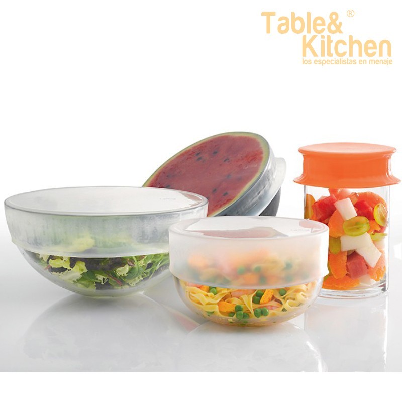 Tampa extensível de silicone Lekue que permite conservar alimentos hermeticamente na geladeira de maneira fácil.