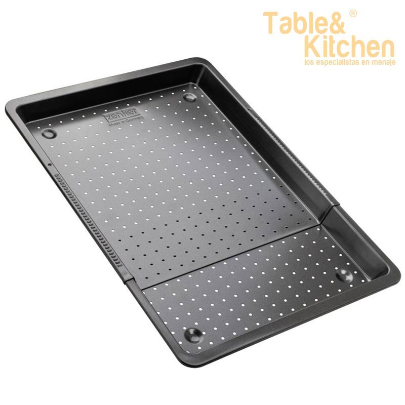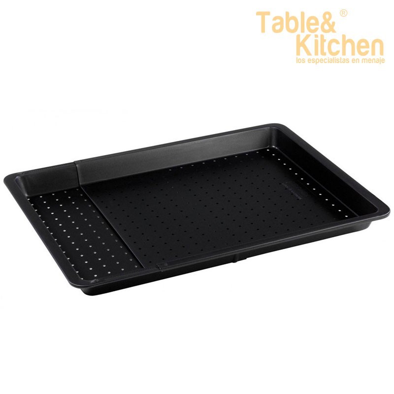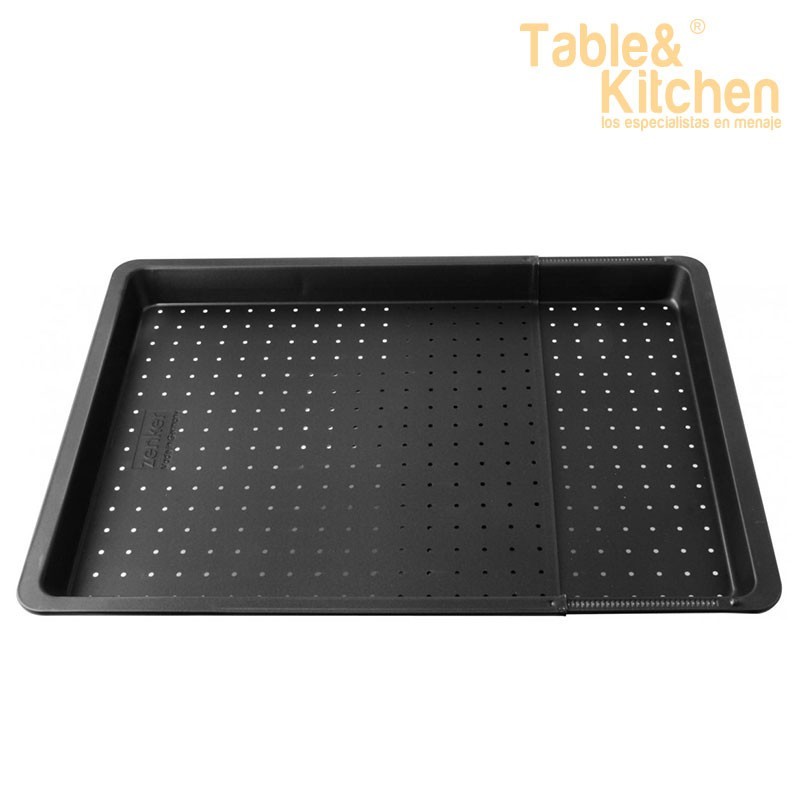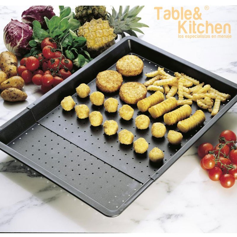 Fundo da bandeja perfurado, o que assegura um cozimento uniforme do alimento, deixando-o dourado por fora.