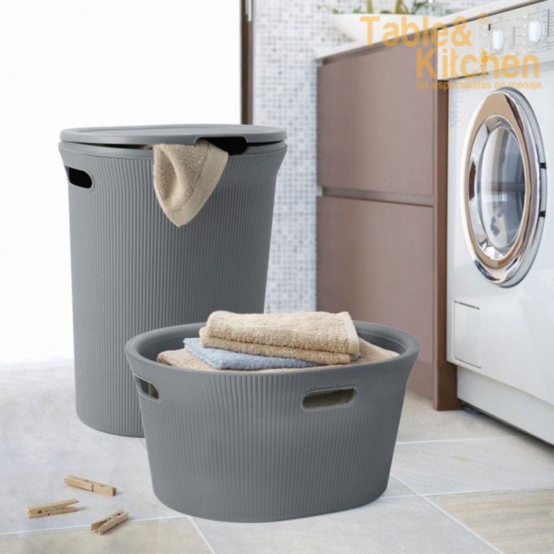 Contêiner para roupa de cor cinza antracita com capacidade para 40 litros. Design com ondulações verticais, aparência discreta e elegante. Fabricado com PP de alta qualidade. Grande capacidade e resistência.