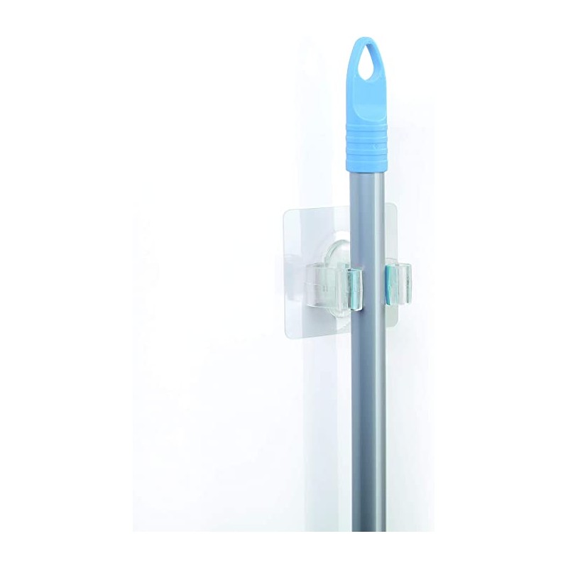 Ganchos adesivos para pendurar na parede o cabo de vassouras e esfregões. Não é necessário fazer furos, basta colocá-lo em uma superfície lisa e limpa. Suporta até 5kg.