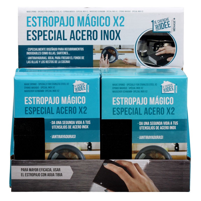 Conjunto de 2 esponjas de limpeza projetadas especialmente para revestimentos de aço inoxidável em panelas e frigideiras. Essas esponjas são ideais para eliminar depósitos de cozimento e ferrugem sem riscar a superfície.