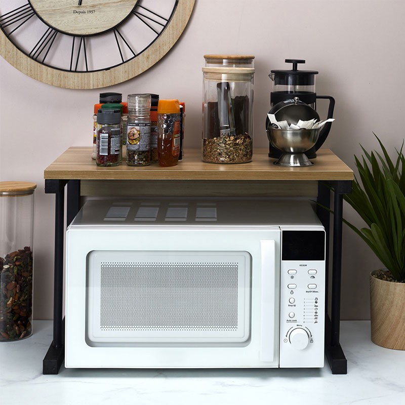 Prateleira organizadora de microondas projetada para otimizar o espaço na sua cozinha. A prateleira superior é perfeita para colocar especiarias e outros utensílios de cozinha.