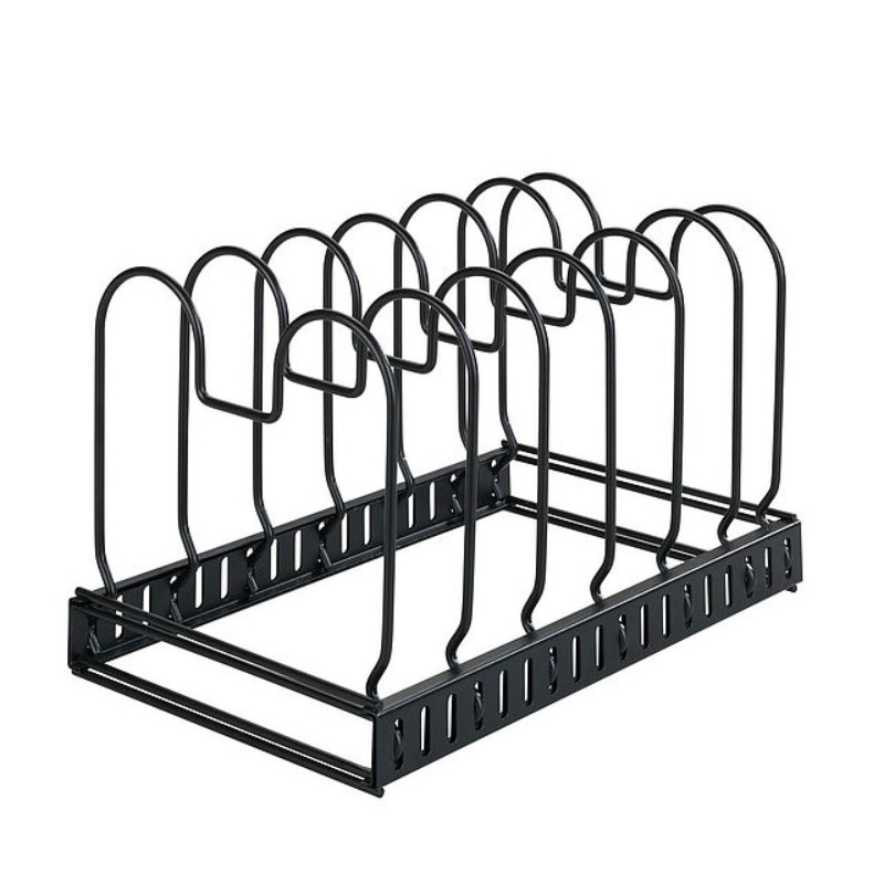 Suporte para frigideiras, tampas e bandejas, extensível de 30 a 57cm, de cor negra.