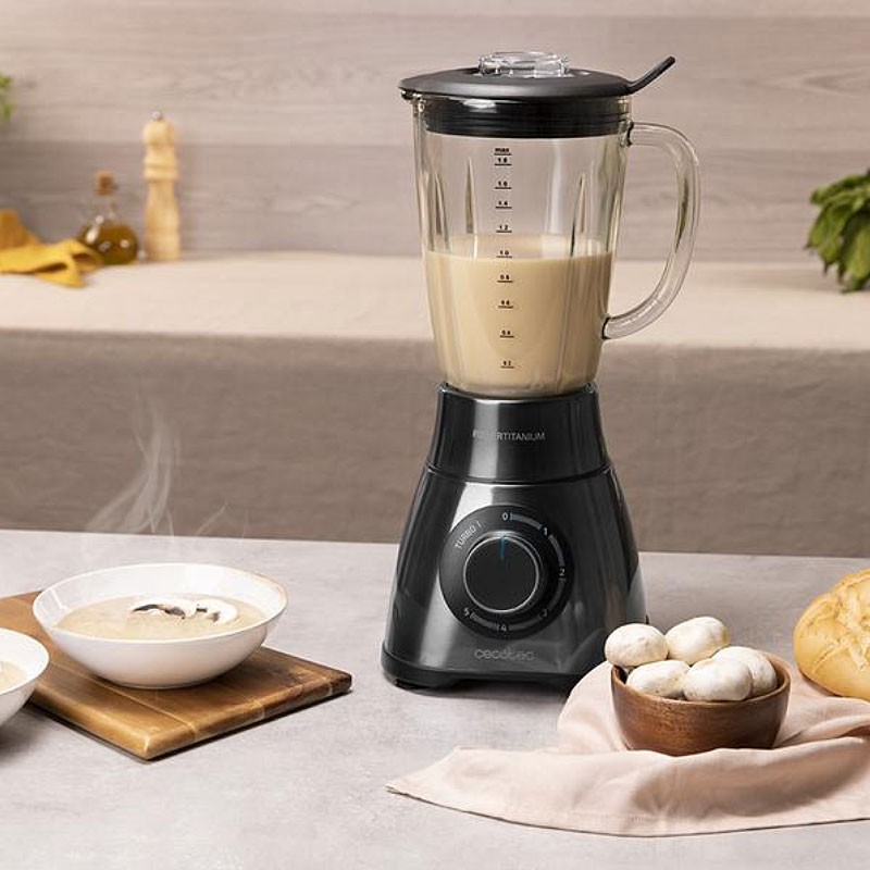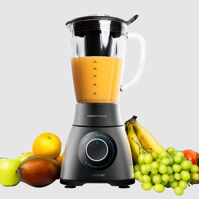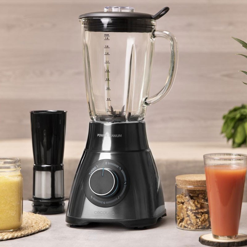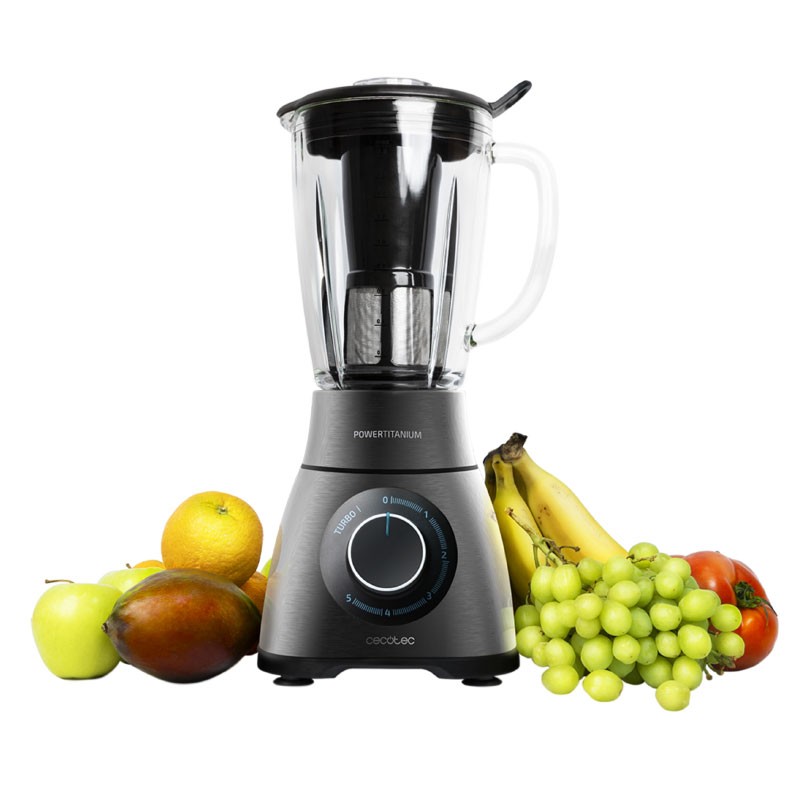 O Liquidificador de Copo Power Black Titanium 1500 PerfectMix da Cecotec é um potente liquidificador com 1500 W de potência, equipado com uma lâmina de 8 folhas recoberta de titânio negro e uma capacidade de 1,8 litros. Também inclui um filtro para sucos.