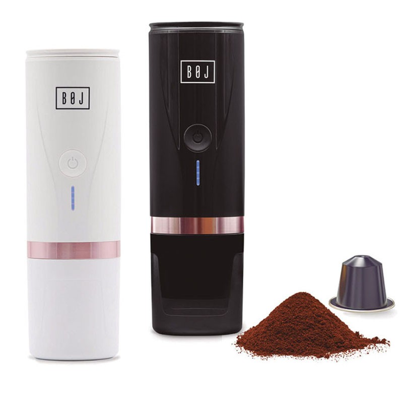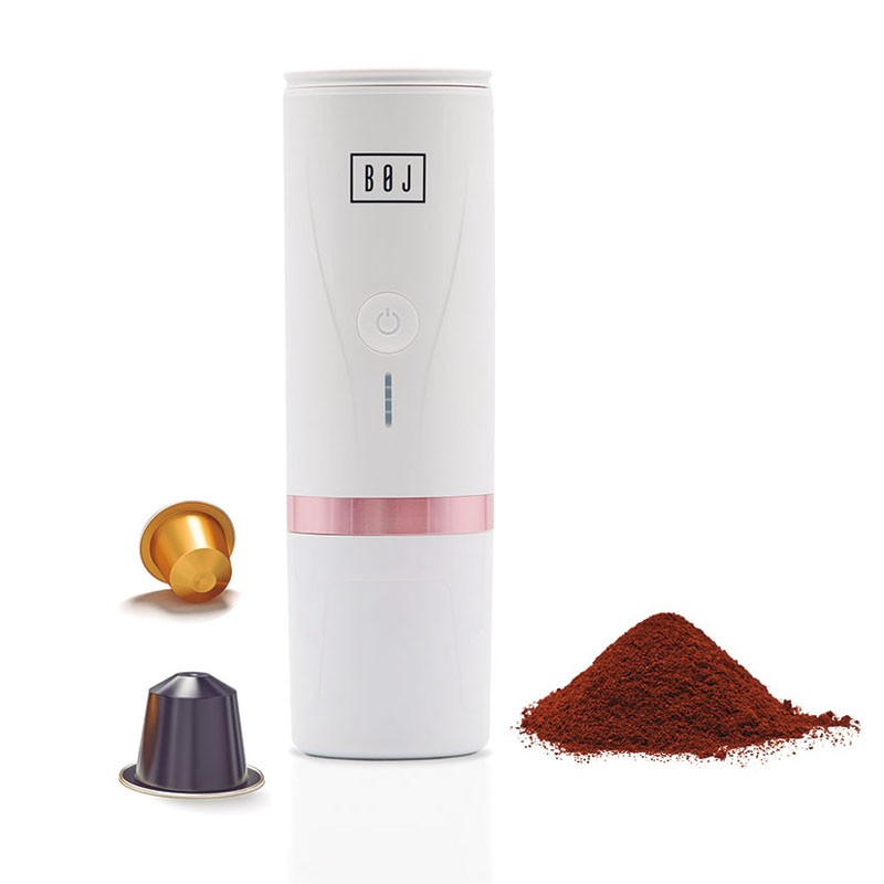 Máquina de café portátil BOJ Giro branca para cápsulas tipo Nespresso ou café moído.