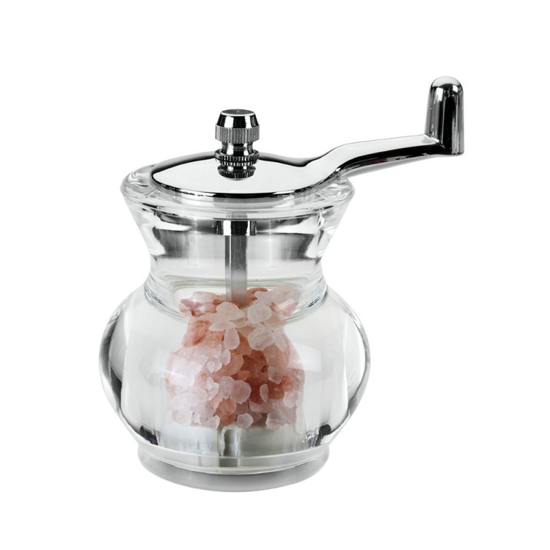 Moedor de pimenta a manivela fabricado em acrílico com um mecanismo de moagem cerâmica.