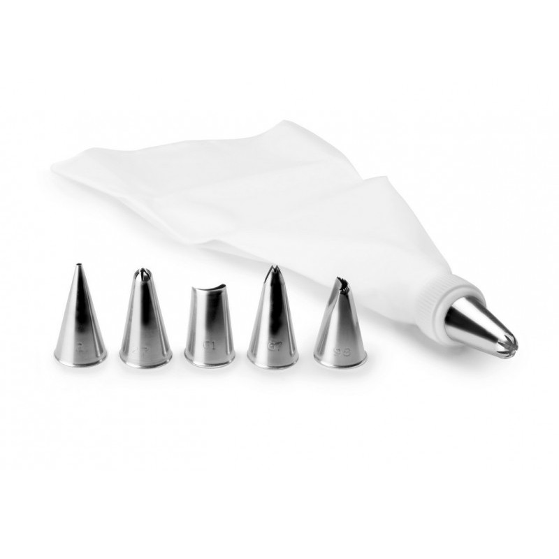 Contém um saco de confeitar reutilizável de 25cm e 6 bicos de aço com os designs mais utilizados para decorar tortas, bolos ou cupcakes.