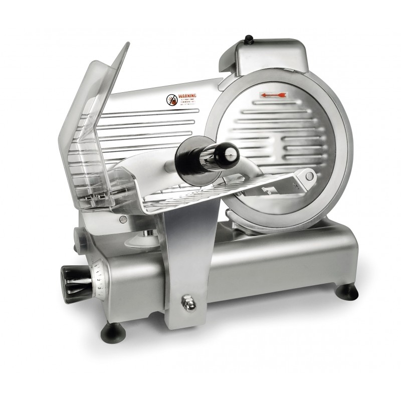 A lâmina ou disco de corte possui um diâmetro de 250 mm e é fabricada na Itália com aço inoxidável de alta qualidade (material que oferece excelente resistência à corrosão e aos ácidos alimentares e sais, liso, não poroso e muito higiênico, fácil de limpar). A espessura do corte é regulável entre 0 e 12 mm.