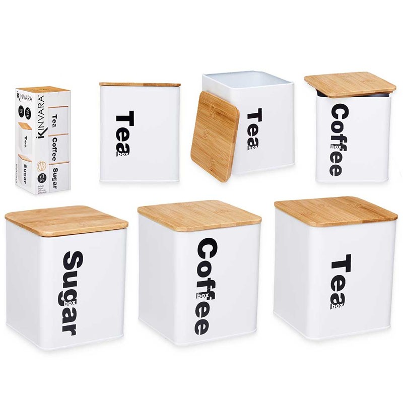Conjunto de 3 peças de pote de metal branco com tampa de bambu de 1,3 litros para açúcar, café e chá.