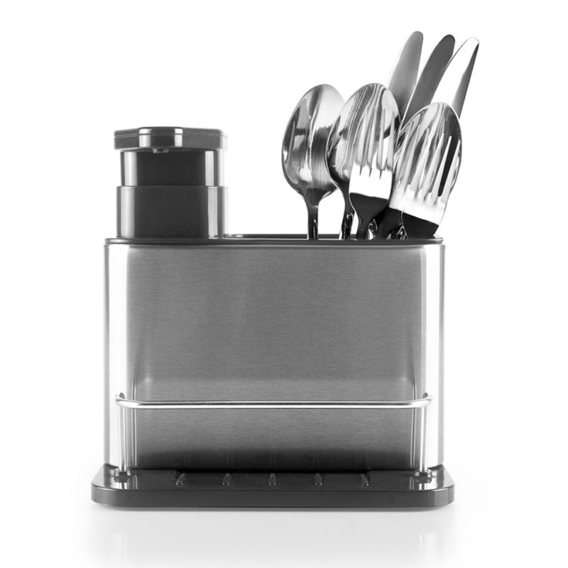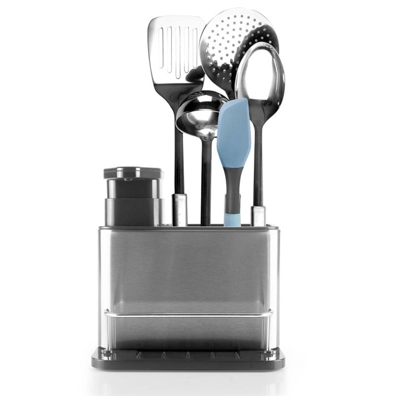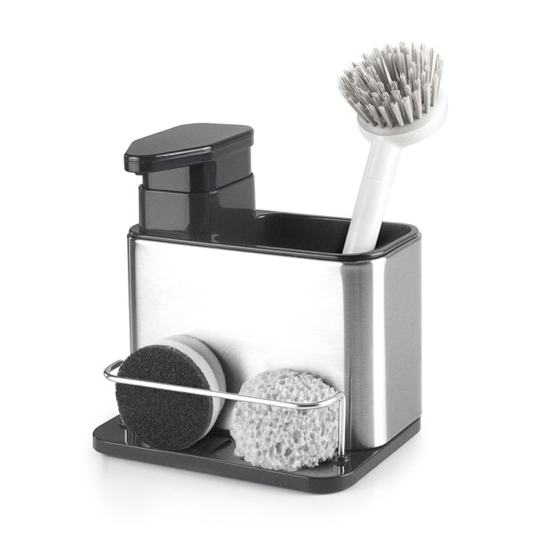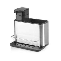 É um prático recipiente para utensílios e saboneteira em um mesmo pacote. Dispoe de espaço para colocar a esponja. É ideal para tê-lo na parte superior da pia.