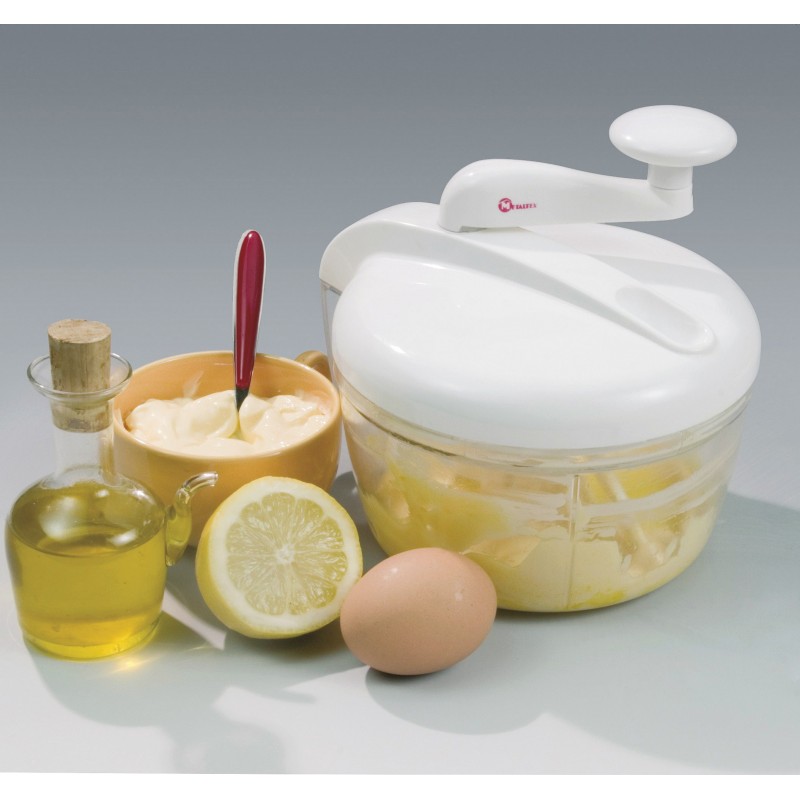 1 - BATEDOR: Para preparar condimentos, bater ovos, fazer maionese, molhos, batidos de leite, purê de batatas ou para montar claras e nata. A abertura superior em forma de funil permite despejar líquidos diretamente dentro do recipiente transparente sem a necessidade de remover a tampa.