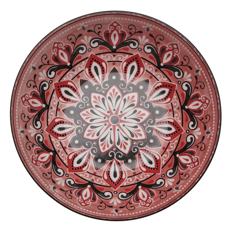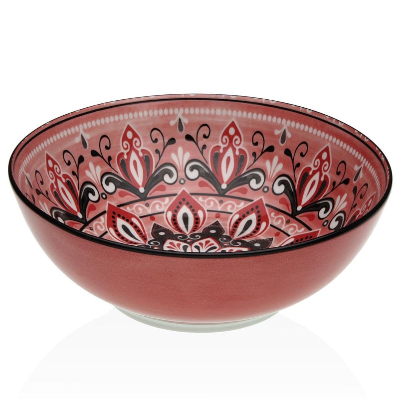 Tigela de porcelana vermelha de 23 cm com design artesanal e padrões orientais, ideal para servir saladas e aperitivos com estilo.