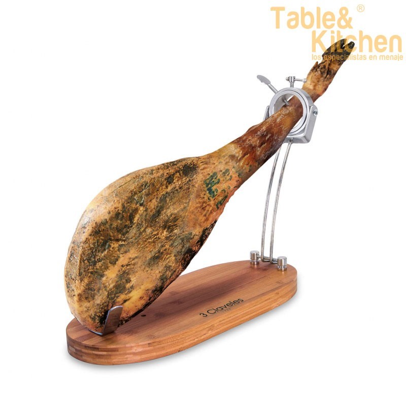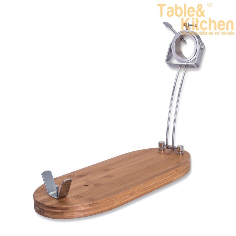 Suporte para presunto fabricado em madeira de bambu e metal, dobrável para guardar ocupando o mínimo espaço e com cabeça giratória, para virar o presunto facilmente.