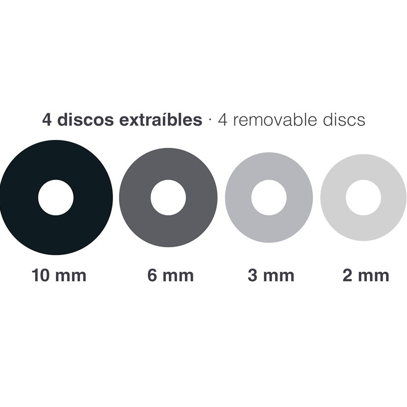 Dispõe de 4 discos removíveis: Ø10mm / Ø6mm / Ø3mm / Ø2mm. Inclui guias de medida gravadas no rolo.