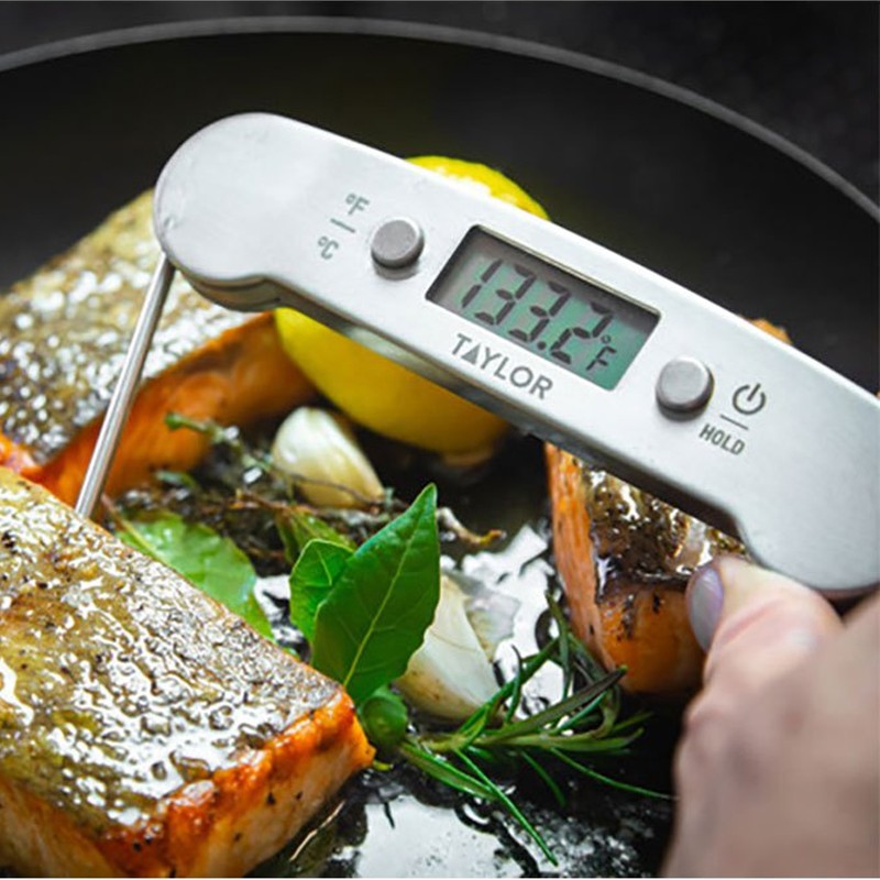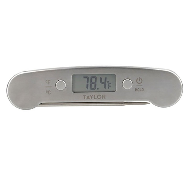 A sonda do termômetro dobrável para carne da Taylor fornece leituras de temperatura interna altamente precisas em um instante.