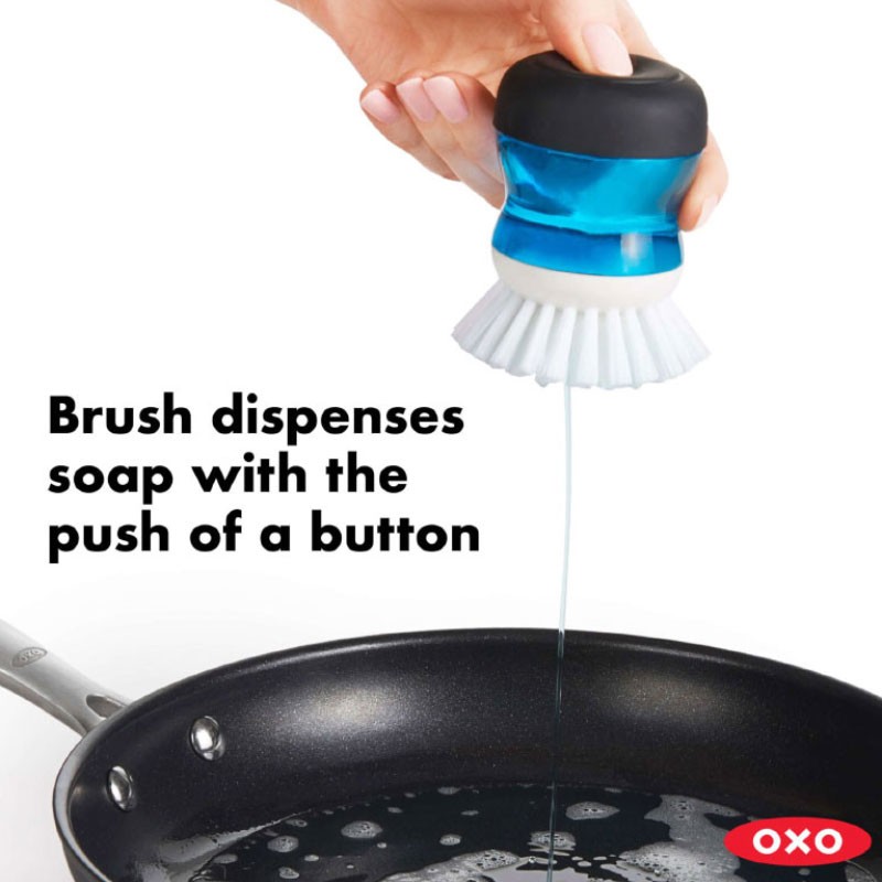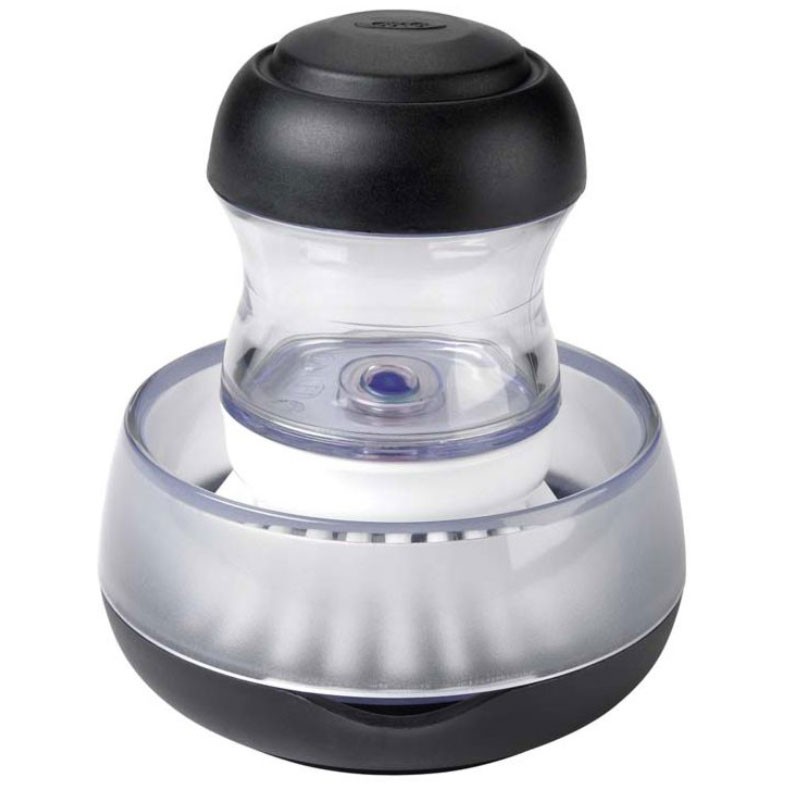 É uma escova pequena de mão com cerdas de nylon, ideal para esfregar panelas e frigideiras sem danificar o antiaderente. Conta com um cabo ergonômico e um suporte com uma bandeja de gotejamento removível que tem um bico, perfeito para coletar o excesso de água. Além disso, é muito simples de usar e você poderá dosar o sabão de forma controlada, apenas apertando um botão.