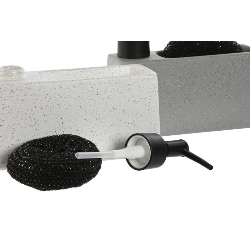 É um prático dispensador de sabonete para pia com espaço para guardar o esfregão.