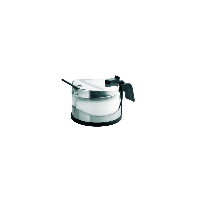 Açucareiro fabricado em aço inoxidável e vidro com colher de plástico incluída.