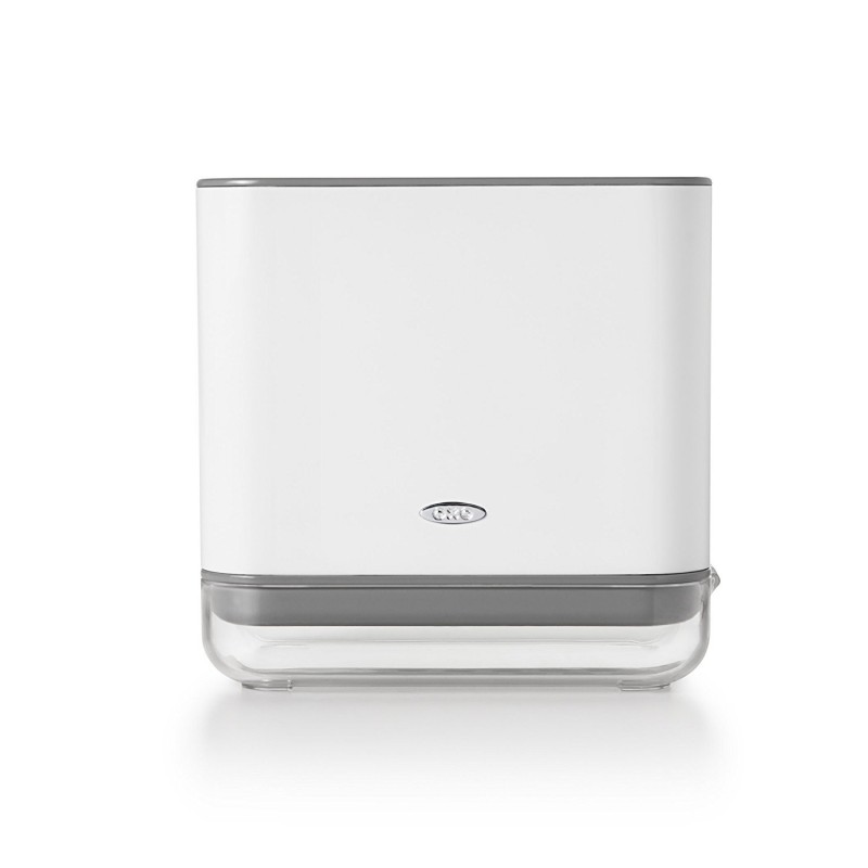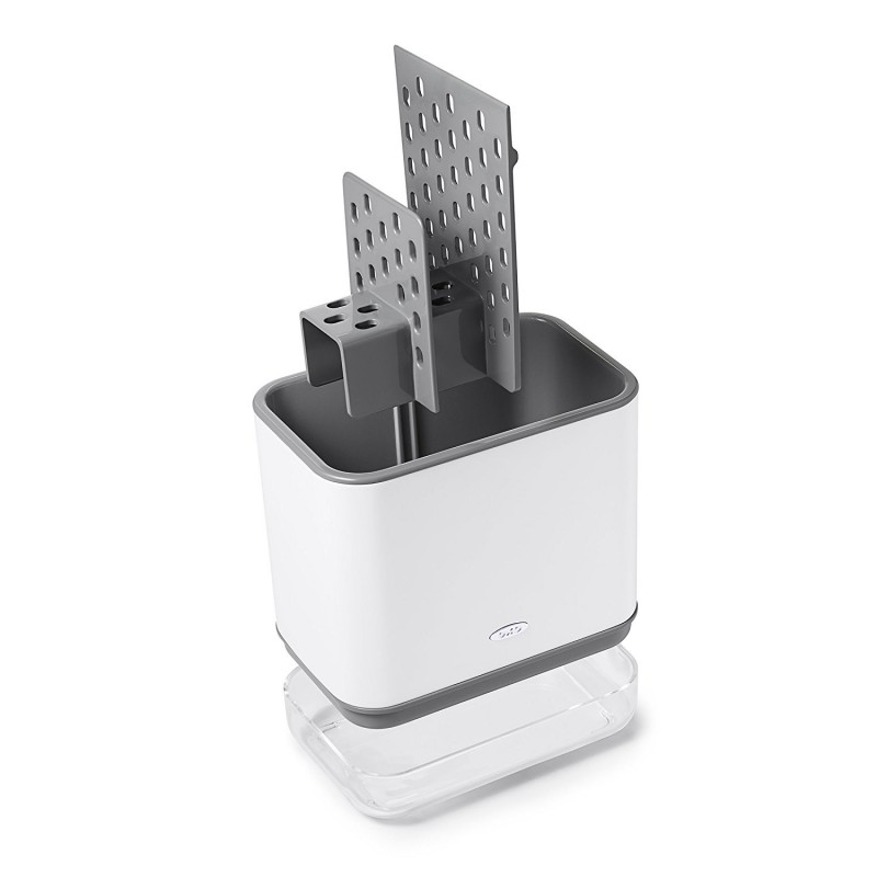 Suporte de plástico projetado para manter organizadas as escovas e esponjas da Iris.