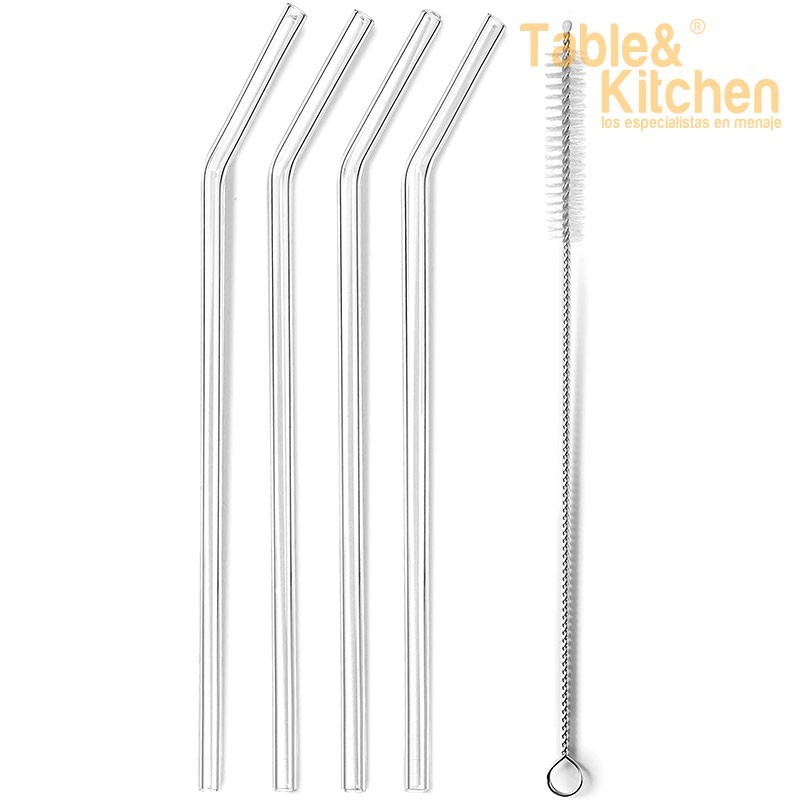 Conjunto de 4 canudos de cristal borossilicato, reutilizáveis, higiênicos e duráveis. Inclui escova para facilitar a limpeza e são aptos para máquina de lavar louça.