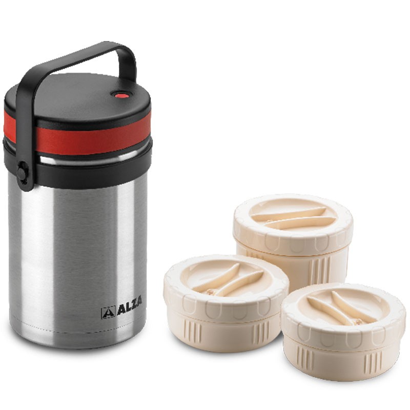O Termo Lunch de 1,5 litros é um termo de aço inoxidável com três compartimentos para manter os alimentos separados de maneira conveniente.