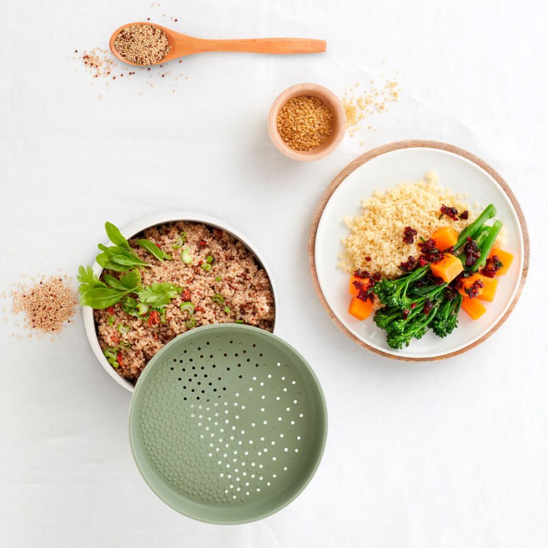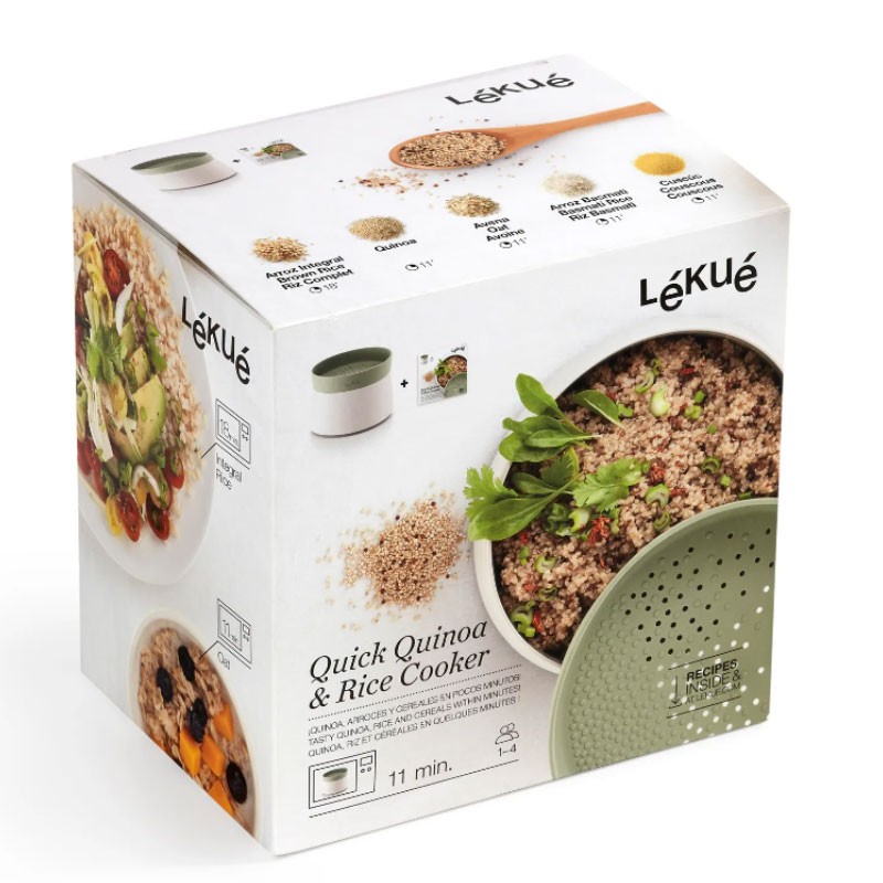 O Quick Quinoa & Rice Cooker da Lekue é a maneira mais rápida e conveniente de cozinhar todo tipo de cereais como quinoa, arroz, aveia, cuscuz, etc. Você pode fazê-lo no microondas e no mesmo recipiente você cozinha, escorre e serve.