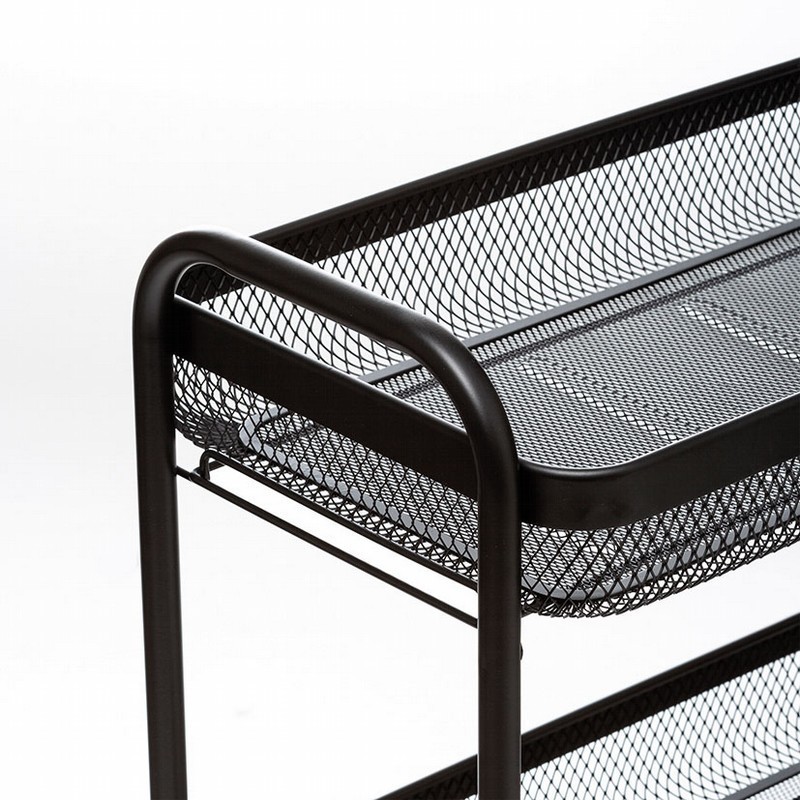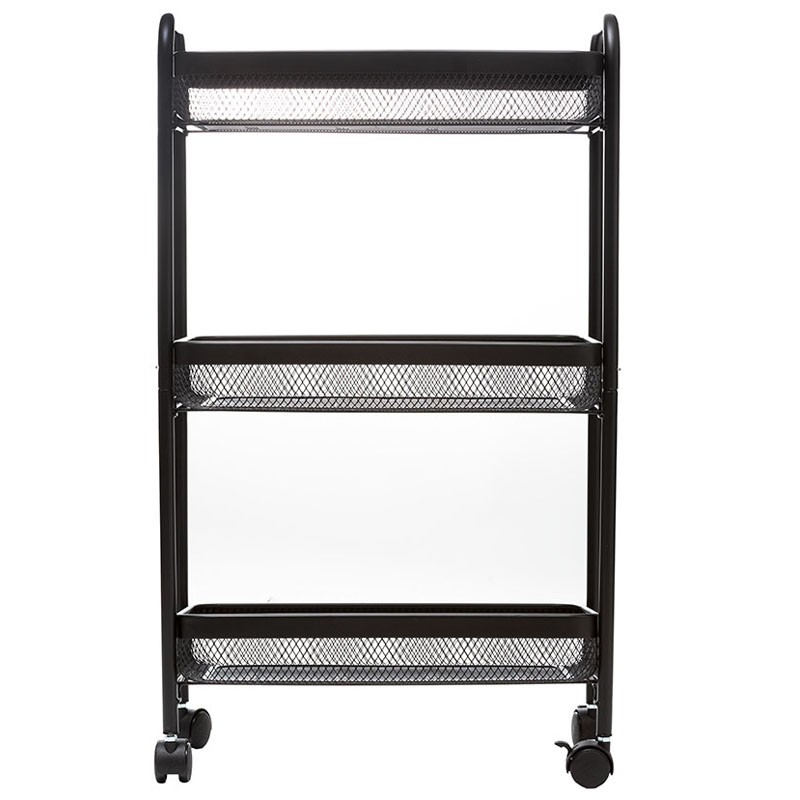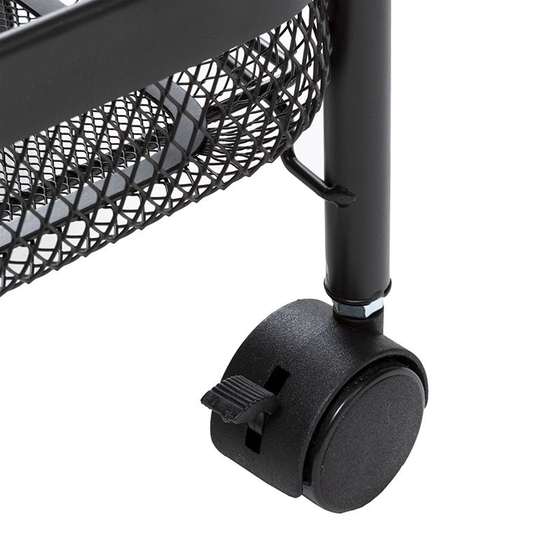 Este carrinho auxiliar apresenta uma estrutura de grade de metal pintada de preto, o que lhe proporciona durabilidade e um aspecto elegante. Suas dimensões compactas de 47x27xh.79 cm o tornam apropriado para espaços reduzidos sem sacrificar a capacidade de armazenamento.